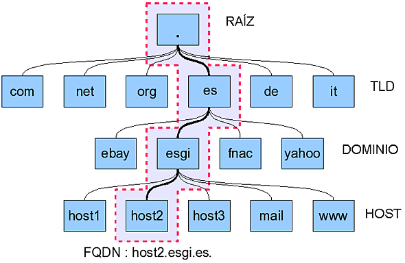 Los servidores DNS de internet se reparten las resoluciones de dominios de forma jerárquica como se muestra en la siguiente foto: