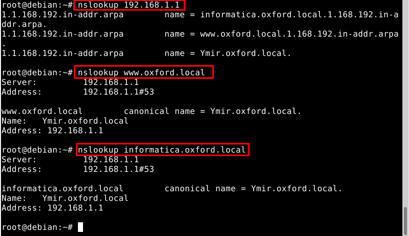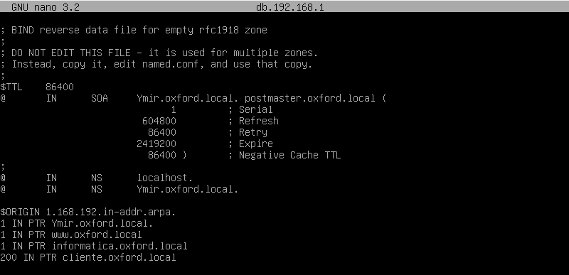 1 IN PTR Ymir.oxford.local: Decimos que el dominio Ymir.oxford.local está registrado en la ip 192.168.1.1, solo tendremos que poner 1 ya que hemos creado una variable anteriormente.
