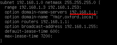 Por último configuraremos el dhcp para que que le de como servidor DNS principal a los clientes la ip de nuestro servidor. Modificaremos /etc/dhcp/dhcpd.conf