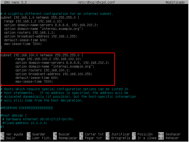 Luego de modificar el fichero anterior debemos de modificar el más importante «/etc/dhcp/dhcpd.conf» y añadiremos las siguientes líneas: