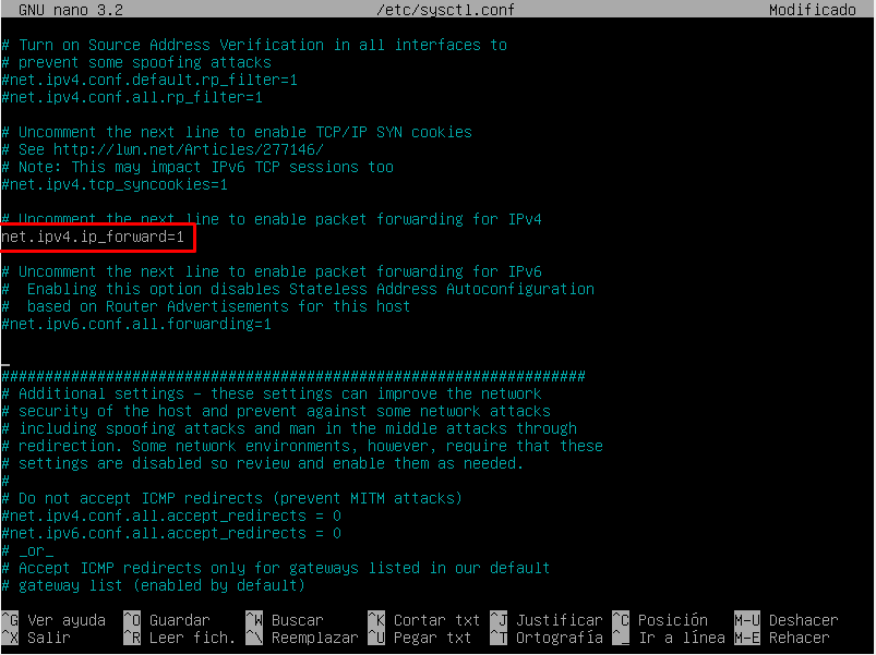 Luego, debemos de abrir el fichero /etc/sysctl.conf con el comando nano, y modificamos el fichero buscando la línea «net.ipv4.ip_forward=1».