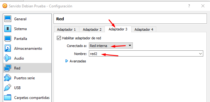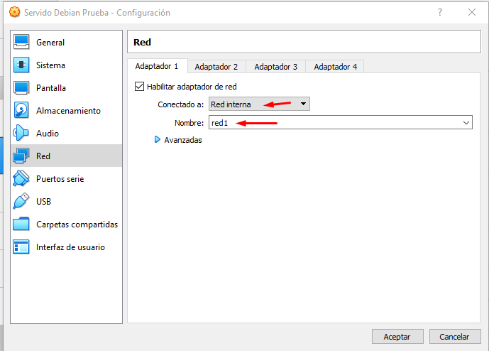 Primero añadimos una tarjeta de red interna con la red llamada «red1» y otra tarjeta de red interna con el nombre «red2»
