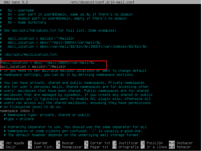 Por último indicamos cual va a ser la localización de la carpeta de nuestros buzones modificando el fichero /etc/dovecot/conf.d/10-mail.conf