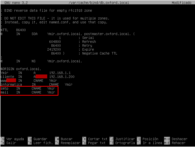 Para que nuestros clientes resuelvan nuestros servicios pop3 y smtp configurando el fichero /var/cache/bind/db.oxford.local y añadimos las siguientes líneas: