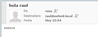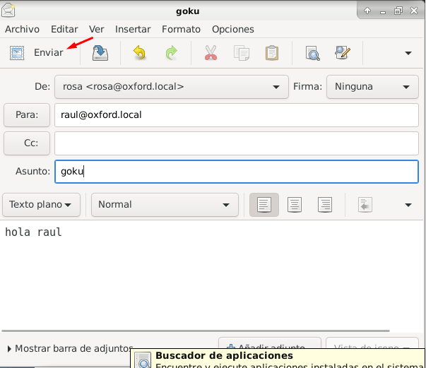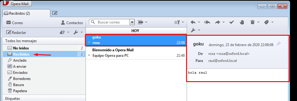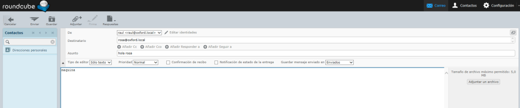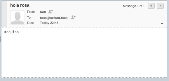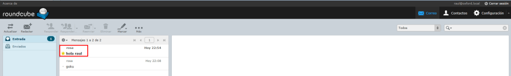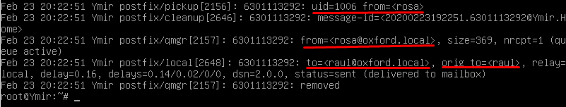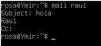 Enviamos un correo de con el usuario rosa a raul, luego comprobamos si a raul le ha llegado el correo y por último miramos el log en /var/log/mail.log.