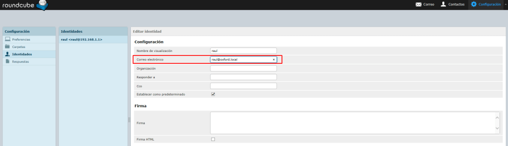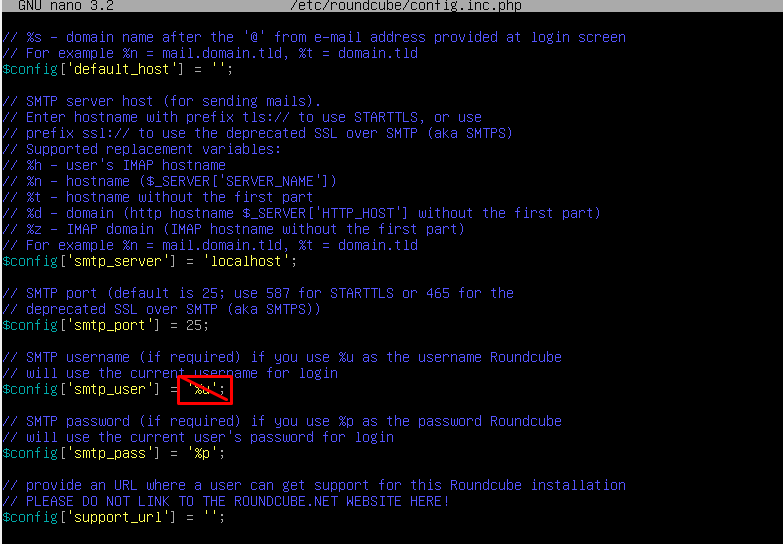 Una vez instalado tenemos que configurar el fichero /etc/roundcube/config.inc.php y borrar el %u de la líneas marcada: