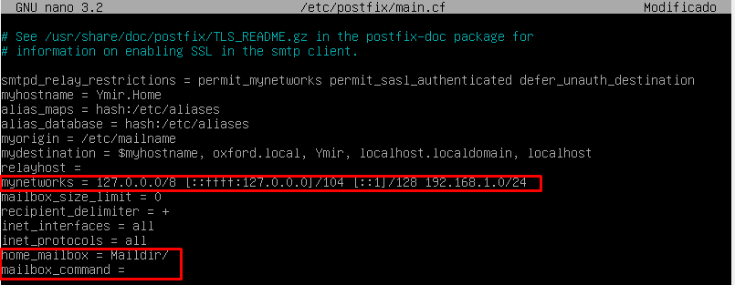 Ahora configuraremos el servicio pop3 entrando y configurando /etc/postfix/main.cf