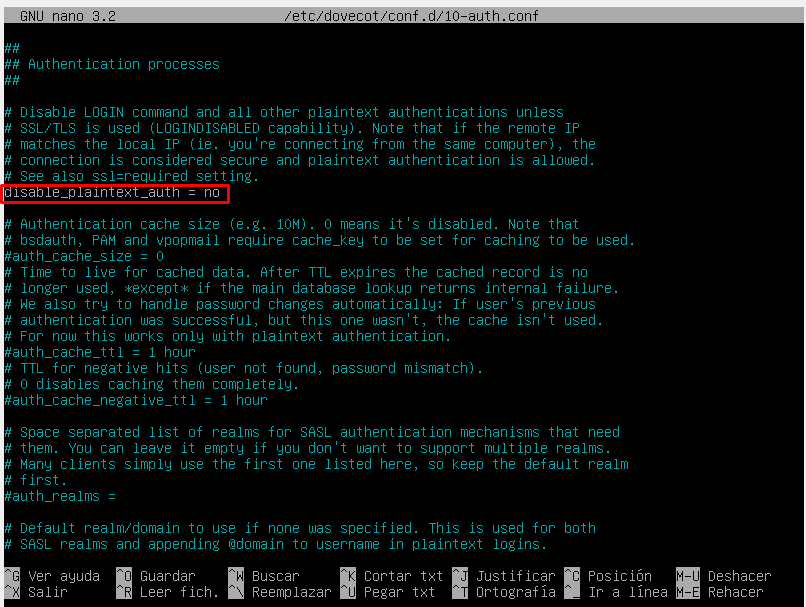 Para habilitar la autentificación por contraseña en claro debemos de editar el fichero /etc/dovecot/conf.d/10-auth.conf